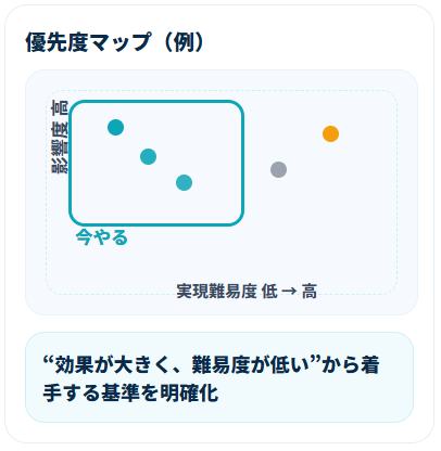 - ロードマップと費用対効果の見える化資料を作成(経営説明まで支援)